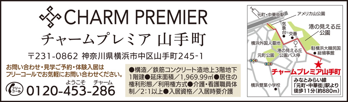 異国情緒あふれる横浜・山手のヘボン邸跡地に佇む全室個室36室の介護付有料老人ホーム「チャームプレミア山手町」。全国で60以上の老人ホームを運営する(株)チャーム・ケア・コーポレーション(東証一部上場)が一昨年12月にオープン。ホーム長の美才治和人さんに話を聞いた。