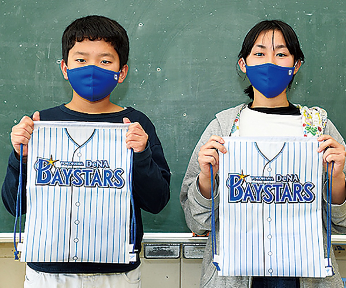 中身はナップサック、フェイスカバー、ミニタオルのセット。元街小学校=中区=6年の浜崎悠生さんと宮崎加歩さんが代表でギフトバッグを受取った。「もらったハンドタオルをしっかり持ち歩いて生活したい。昨年はコロナであまり応援に行けなかったですが、試合も観に行きたいですし、チームにも勝って欲しい(浜崎さん)」「ベイスターズの選手は私たちファンのことを大切に思ってくれている。中学生になったらスタジアム近くに住む祖父と一緒に応援に行きたい(宮崎さん)」。三浦大輔監督は「ミニタオルは手洗いの時にも使ってもらえたら。元気な子どもたちの姿がまた街にあふれるといい」と思いを語った。