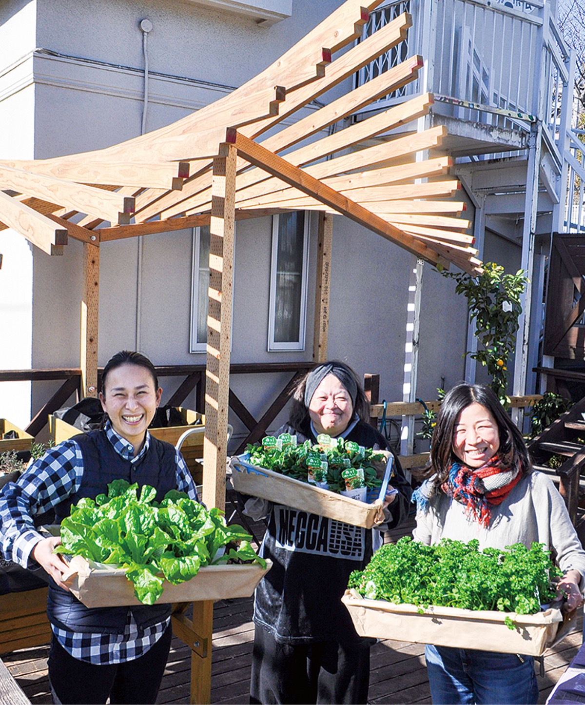 その拠点となる場所は、浅間下交差点近くにある今井嘉江さん宅のウッドデッキ。人目をひく木製パーゴラ(日陰棚)は、建築家の浅沼秀治氏=中区在勤=が設計したもの。10月から工事を始め、12月に完成。高齢者でも立ったまま楽に作業ができるプランターを設置、年明けから野菜やハーブの苗の栽培が始まった。菜園前の掲示板などで地域開放の日を告知し、事前申込制で人数制限をしながら活動を行う。主に、浅間町周辺の地域住民が対象だ。