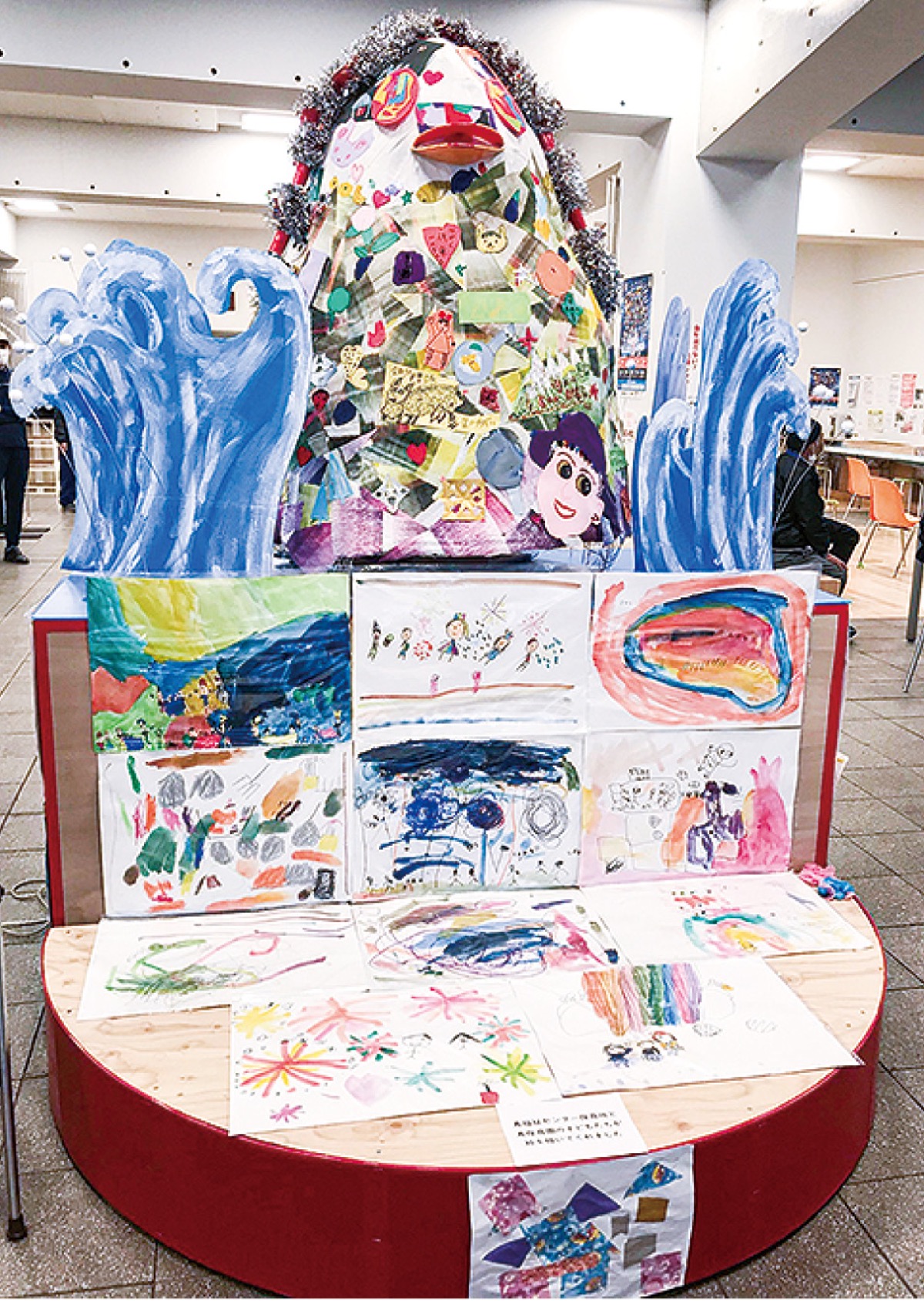 人形などをのせた山車を引くこの祭りは、コロナ禍で昨年は山車の展示のみに。そこで疫病を鎮めるとされる妖怪「アマビエ」などが山車の上に乗せられ、地域の人たちによってウロコなどの装飾が施された。そのほか寿地区の保育園など子どもたちが作成した絵も貼り付けられ、地域一体となった山車が完成した。