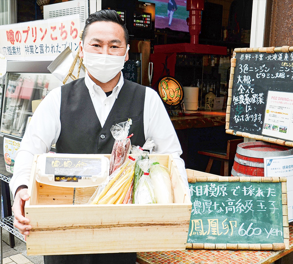 土屋さんは飲食店同様、生産者の危機的な状況を知り少しでも支援になればと、昨年4月からテイクアウト商品を強化。店先で取引農家から仕入れた無農薬野菜や高級卵で作ったプリンを販売したところ好評に。マルシェでも販売される。午前11時30分から午後4時まで。雨天中止。