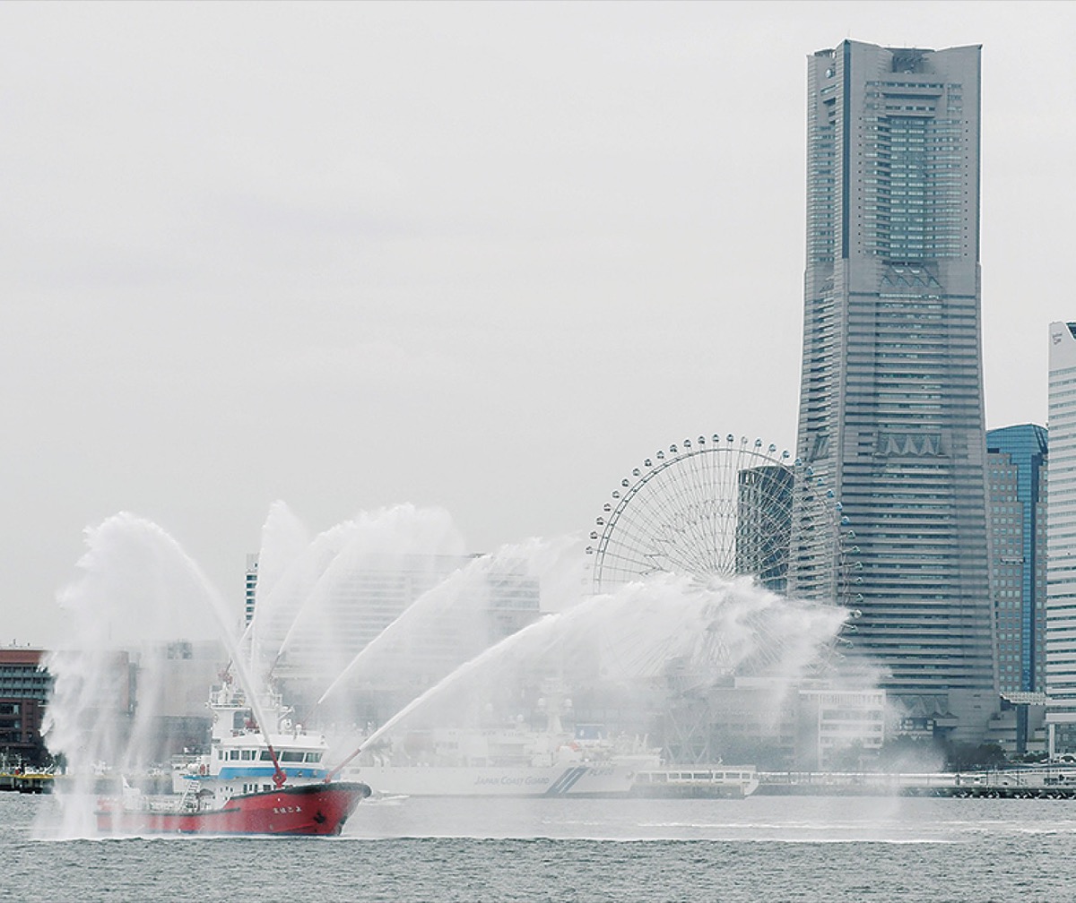 横浜港では、市消防局の消防艇「よこはま」、川崎市消防局の消防艇「かわさき」のほか、趣旨に賛同した横浜海上保安部の巡視船艇「ひりゆう」と「はまぐも」の計4艇が横隊を作り、力強い放水を披露した。全国の消防艇が同時に連携して一斉放水を行う企画は、今回が初めてだったという。