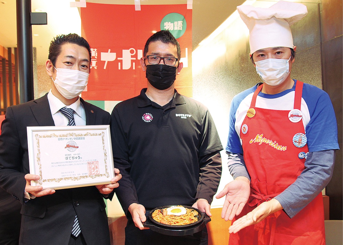 横浜が発祥の地と言われるスパゲティナポリタンを通して地域活性化を図る「日本ナポリタン学会」がお好み焼き店「ぼてぢゅう」の「横浜鉄板ナポリタン」を認定商品に選び、3月25日、ぼてぢゅう横浜ランドマーク店で認定式があった。