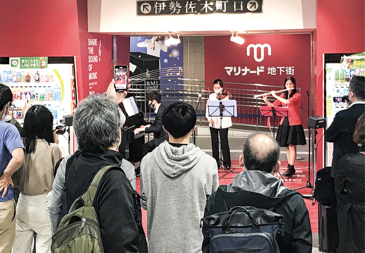 1月の緊急事態宣言以降休止していたマリナード地下街のストリートピアノが、4月1日から利用を再開。その週の日曜日にはピアノとバイオリン、フルートによるライブも行われた=写真。