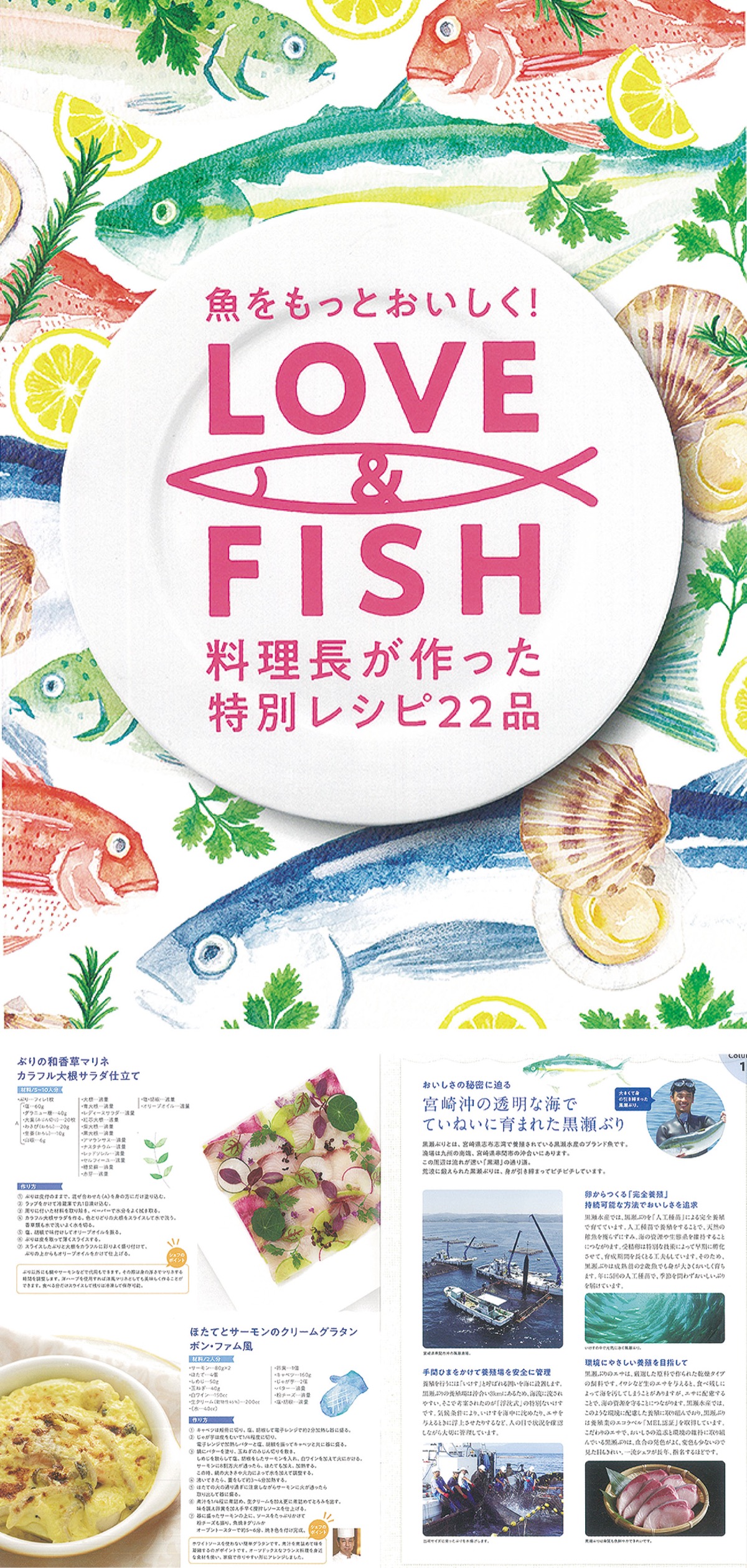 一般家庭の食卓に並ぶ機会も多いブリ、マダイ、サーモン、ホタテ、マグロの国産魚介類を使ったカルパッチョやグラタン、漬け丼など22種類のレシピを掲載。魚食の普及につなげようと、それぞれの魚介類を市場に出荷している生産者のこだわりや、市場の役割などのコラムも掲載している。