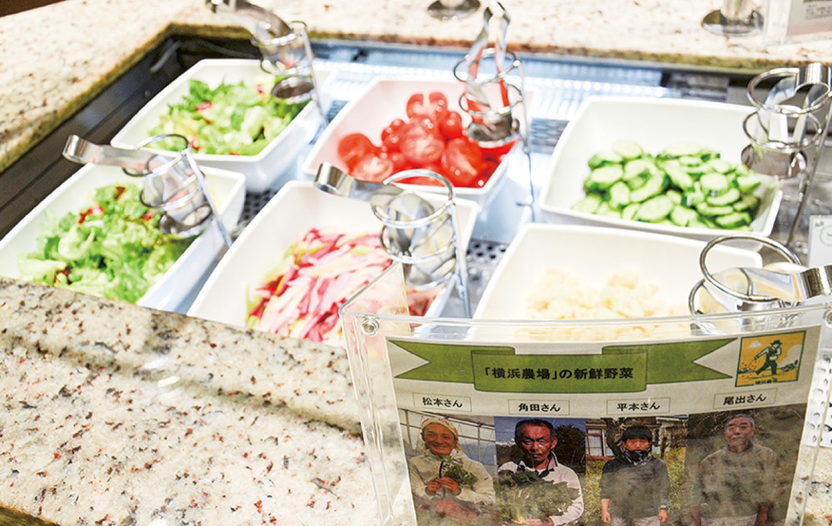 特にサラダの野菜は横浜市内の契約農家へシェフ自らが足を運び、季節に合わせた新鮮な野菜を選定。それらをメニューに取り入れているレストランとして「よこはま地産地消サポート店」に登録し、市が推奨する「横浜農場」の取り組みに賛同するほか、株式会社ヤサイクルと共同取り組みを行う「自立循環型食品リサイクルループ=ヤサイクル」を2008年から導入し、食品ロス削減のために、ホテル館内で堆肥化した食品資源で栽培された三浦産のエコ野菜も積極的に使用。この活動が評価され、今年3月に発表された市のSDGs認証制度で上位認証されている。同ホテルでは「地元神奈川の食の魅力をホテルから発信できたら」と話している。