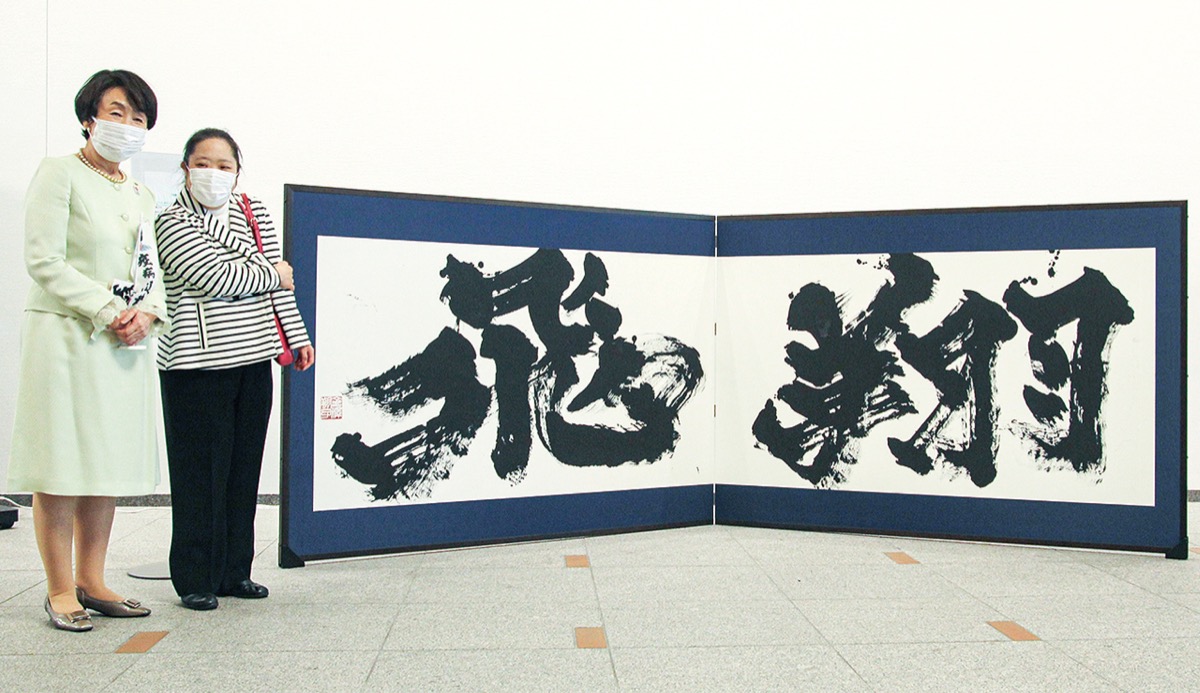 世界的に活動するダウン症の書家、金澤翔子さんが4月23日、横浜市役所を訪れ、東京五輪・パラリンピックへ向けて書いた作品の前で出場する選手へエールを送った。