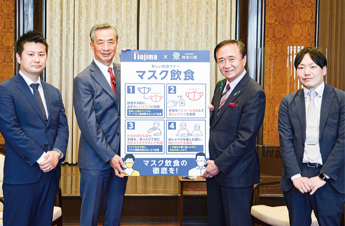 株式会社ノジマ(野島廣司代表執行役社長)=西区南幸=が神奈川県に、マスク飲食推奨用鏡付きポップ20万個を寄付した。4月28日に県庁本庁舎で目録贈呈式が実施され、野島社長と黒岩祐治県知事が出席した。