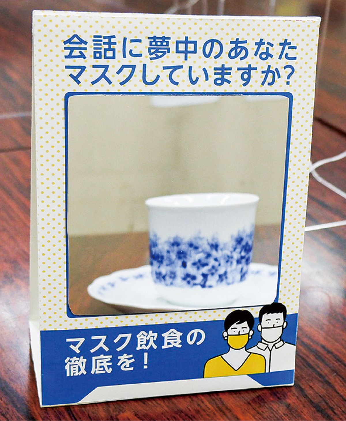 鏡付きポップは県職員のアイデアをもとに、同社が製作。3月中旬に試作品の利用飲食店を募集したところ、当初の予定数を大きく上回る応募があったため増産。県内に約1万3千個の試作品が配布された。