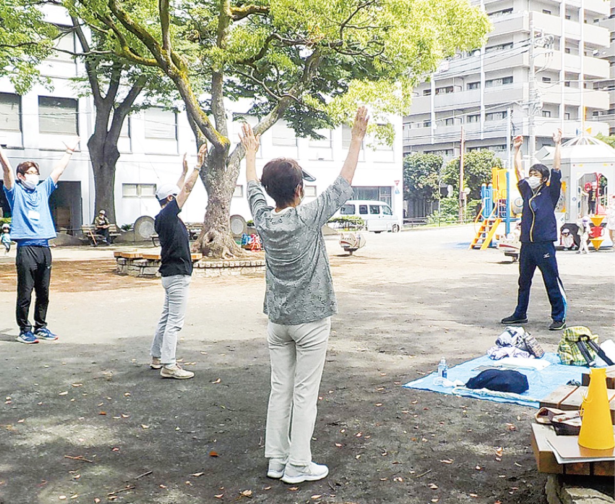 千歳公園=中区山田町=で5月14日に企画「公園で!エクササイズ」が行われ、高齢者を中心に8人が参加した。