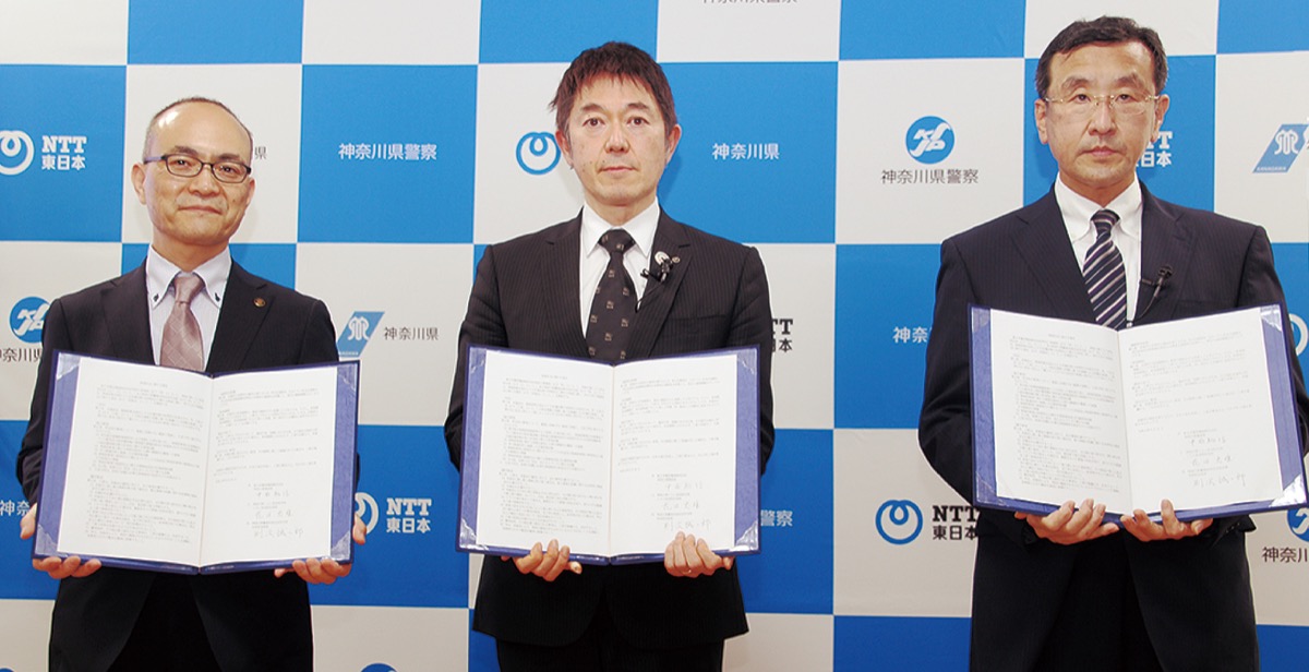 NTT東日本神奈川事業部(中西裕信部長)=中区山下町=は5月26日、神奈川県、県警察本部と「地域安全に関する協定を締結した。3者での協定は初。