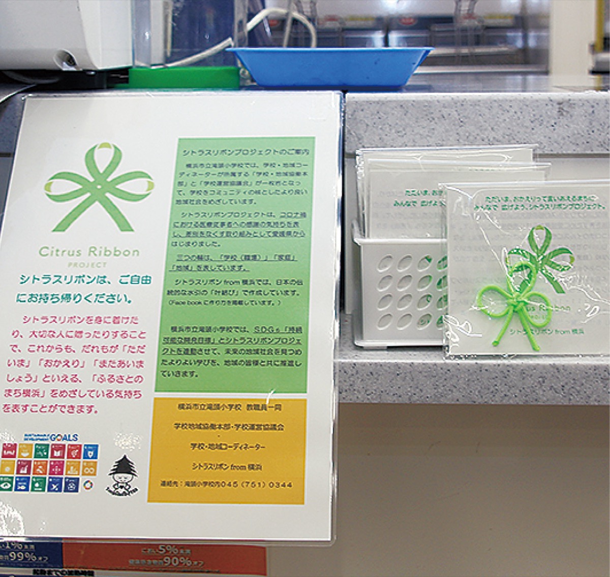 このリボンを地域に広げようと同団体が呼びかけを行うなかで今年3月、磯子区内のファミリマートにも依頼。この店舗を含め、横浜中央エリアを担当する同社の田中紳也さんが「妻が医療従事者として、コロナ過で闘っている。差別や偏見を身近で感じるなかでシトラスリボンの運動は大切なことだと思った」と取り組みに共感し社内で調整。西区、中区、磯子区の3エリアのなかで33店舗の協力に繋がった。