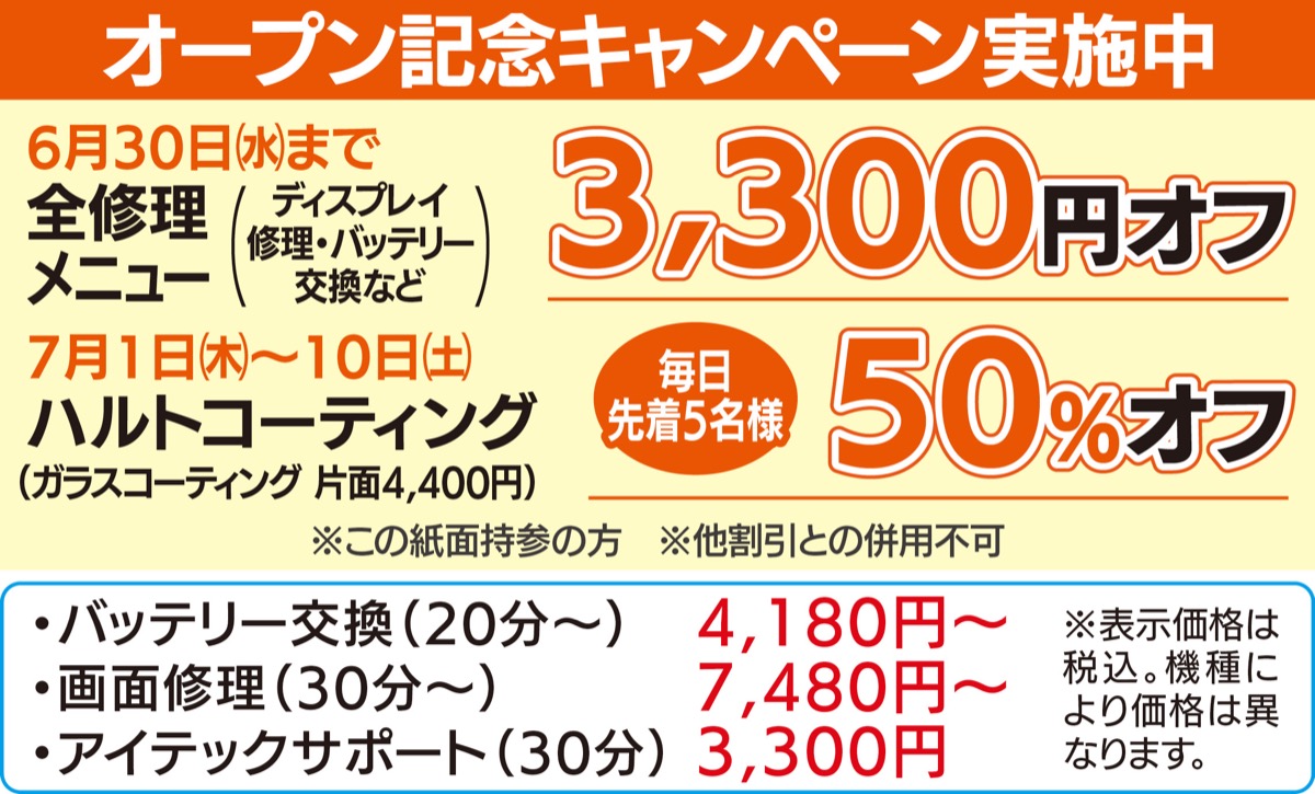 「バッテリーの持ちが悪い」「落として画面が割れた」「機種変更したが設定が分からない」など、ついそのままにしがちなスマホの「困った」。5月にニューオープンした「アイクラックトストアマルイシティ横浜店」に相談してみては。現在キャンペーン=左記=も実施している。