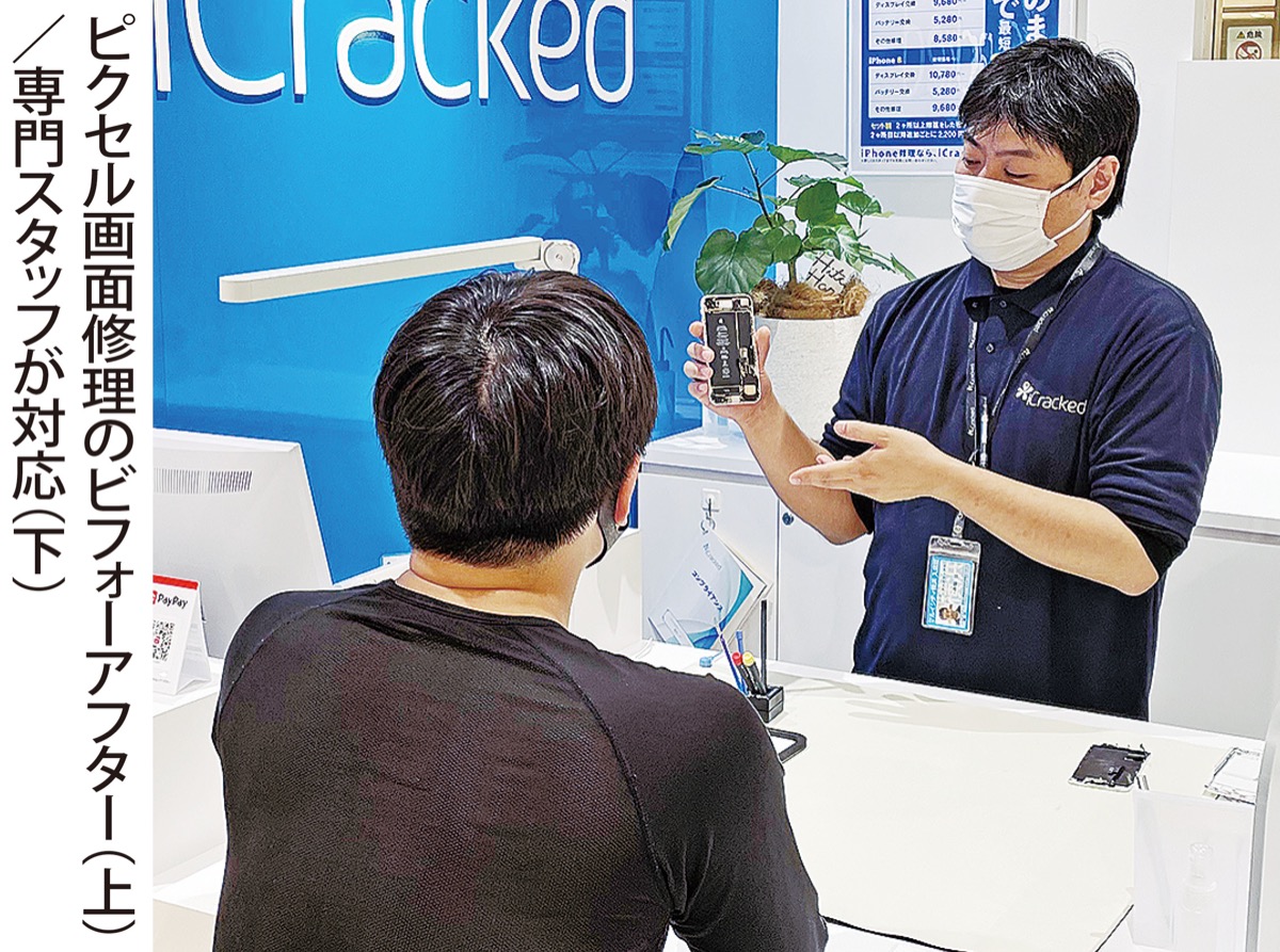 同店は総務省登録修理業者で、グーグルピクセルとアイフォーンを専門にした修理店。厳しい研修を経て試験に合格した専門のスタッフ「アイテック」が、目の前で修理を行ってくれる。