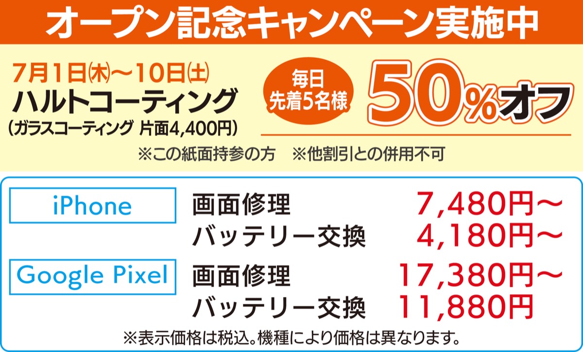 5月新オープン 予約来店でその日にスマホ修理完了