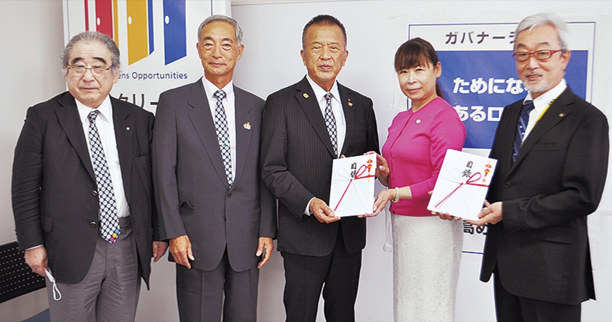ガバナー事務所で行われた贈呈式には、横浜市医師会の川越理香常任理事と川崎市医師会の岡野敏明会長が出席。吉田ガバナー=写真中央=が新型コロナ対応に尽力する医療従事者に向けて感謝の言葉を述べたほか、ロータリー財団委員長の露木雄二さん=同左から2番目=が「医療現場でぜひ役立てていただけたら」と話した。