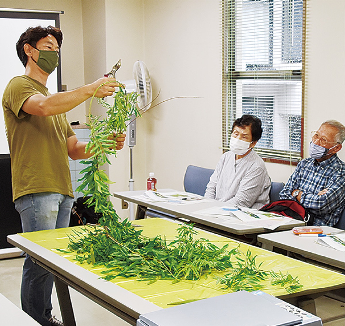 小林さんは藤の枝を会場に用意し剪定方法などを指導=写真。「日照・土壌・水やりがポイント」と説明していた。参加者の多くが自宅で藤を育てているとあって話に真剣に耳を傾けていた。