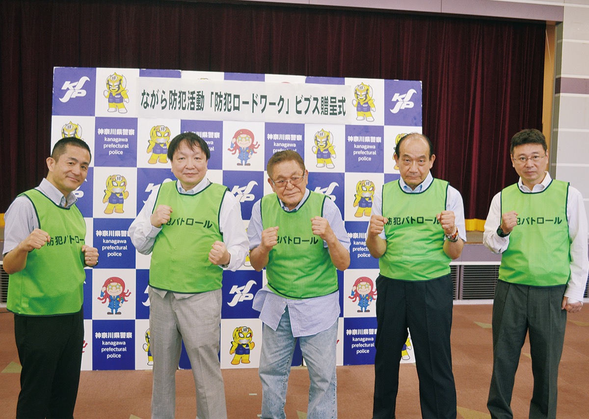 贈呈式には、横浜駅西口の大橋ジム=神奈川区鶴屋町=と横浜さくらジム=鶴見区=、川崎新田ジム=川崎市=、湘南山神ジム=藤沢市=、M.Tジム=相模原市=が出席。県警と県防犯協会連合会からビブスが手渡された。