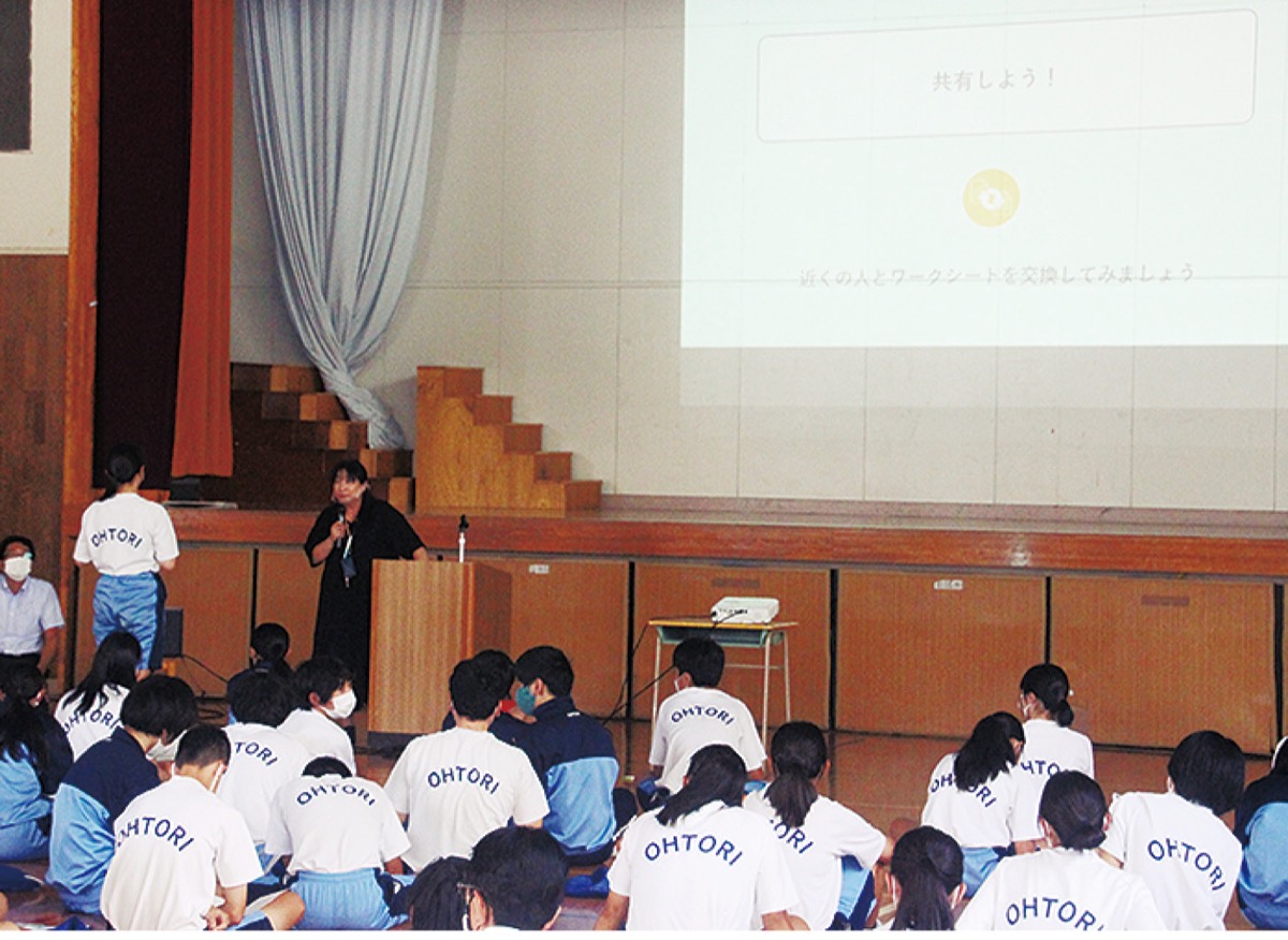 大鳥中学校での授業実践は、日頃から生徒の安全に関する出前授業などで連携する山手署が呼びかけたことで実現。3年生全104人を対象に体育館で学年主任の吉田智子教諭が実践した。