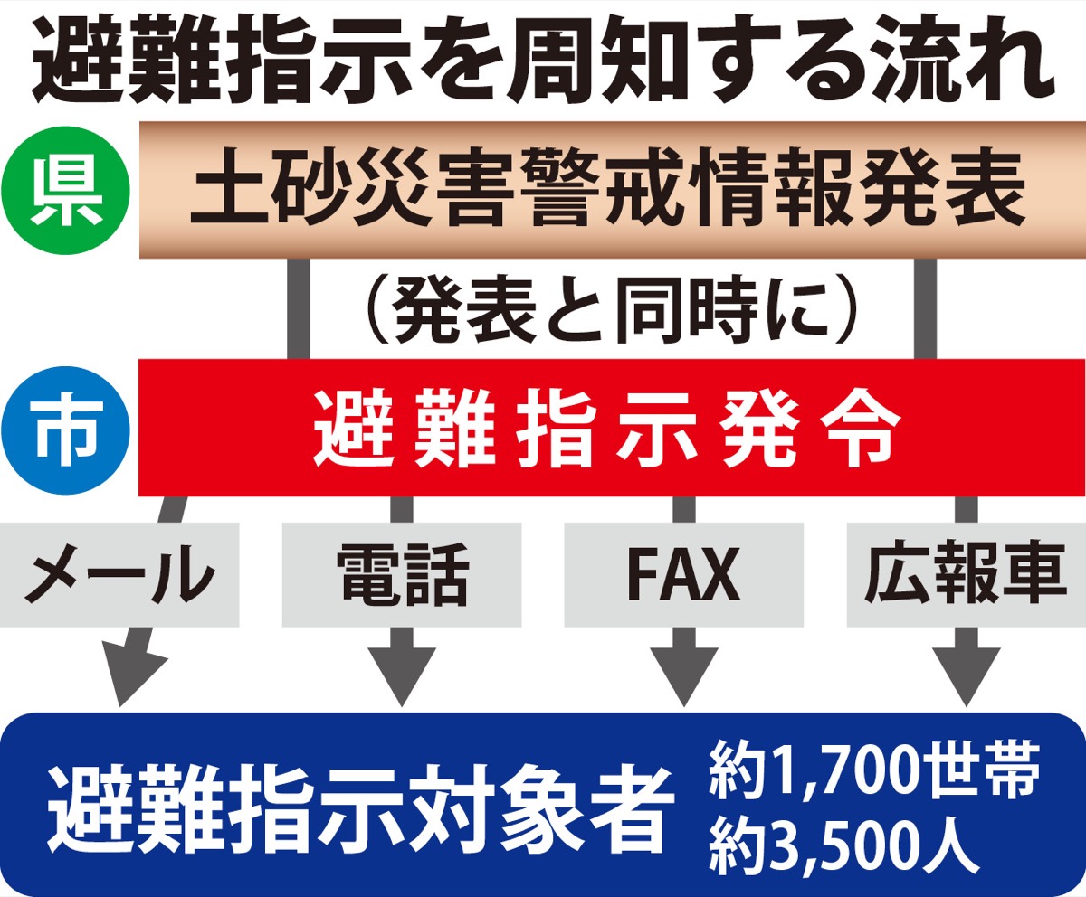 市の発表によると、7月3日午前1時15分に県から同警戒情報が発表され、対象区域の1693世帯、3512人に避難指示を出した。対象世帯には、メールやFAX、電話のアナウンスなどで指示が出たことが伝わる仕組みになっている。