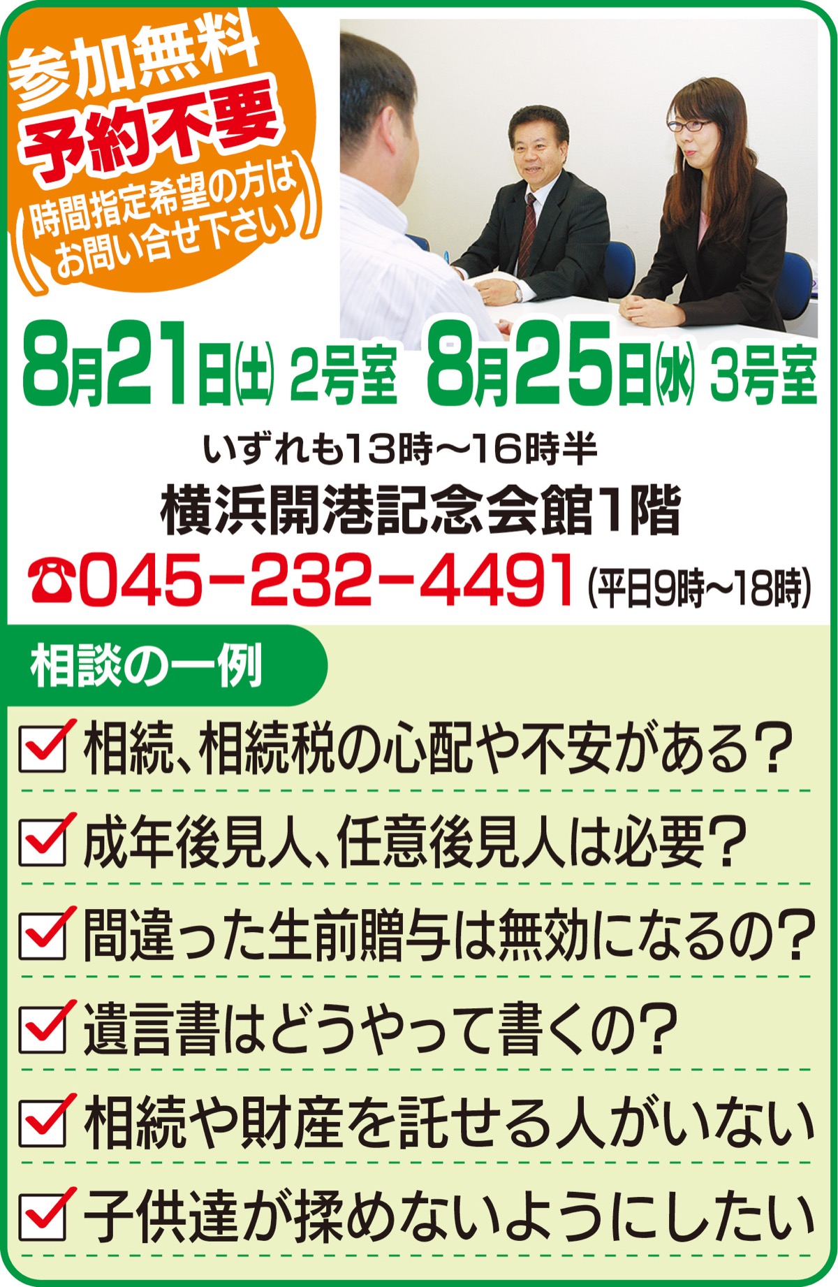 行政書士や司法書士などの士業をはじめ不動産コンサルタントなどの専門家チームによる相続全般に関わる無料相談会が開催される(表参照)。横浜市民 相続 遺言 贈与相談センターの主催。