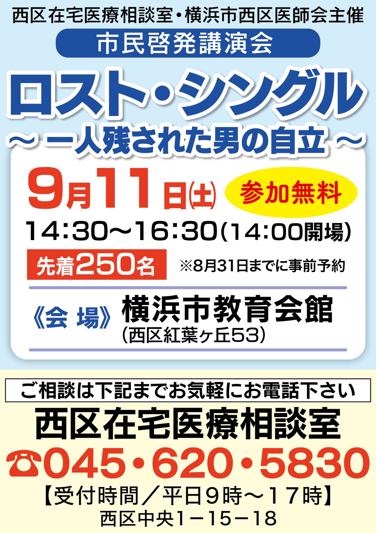 西区在宅医療相談室・横浜市西区医師会主催の市民啓発講演会「ロスト・シングル〜一人残された男の自立〜」が9月11日(土)午後2時半から横浜市教育会館で行われる。講師は国立がんセンター名誉総長の垣添忠生氏。最愛の妻をがんで看取った自らの経験をもとに、一人残された男の生活や立ち直るまでの心構えなどを講演する。