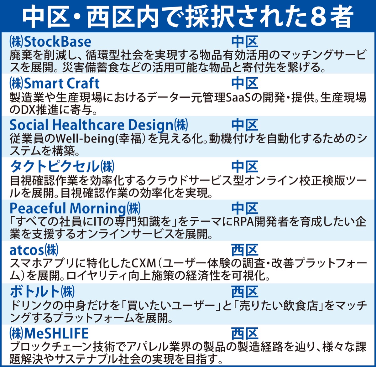 今年度は、DX(デジタルトランスフォーメーション)や脱炭素、エネルギー、ヘルスケア、オンラインサービスなどの分野の事業者が採択。中区からは5者、西区からは3者が選ばれた。特に、中区の(株)StockBaseの関芳実代表取締役は横浜市大の学生で廃棄量を削減し、循環型社会を実現する物品有効活用のマッチングサービスを展開する。