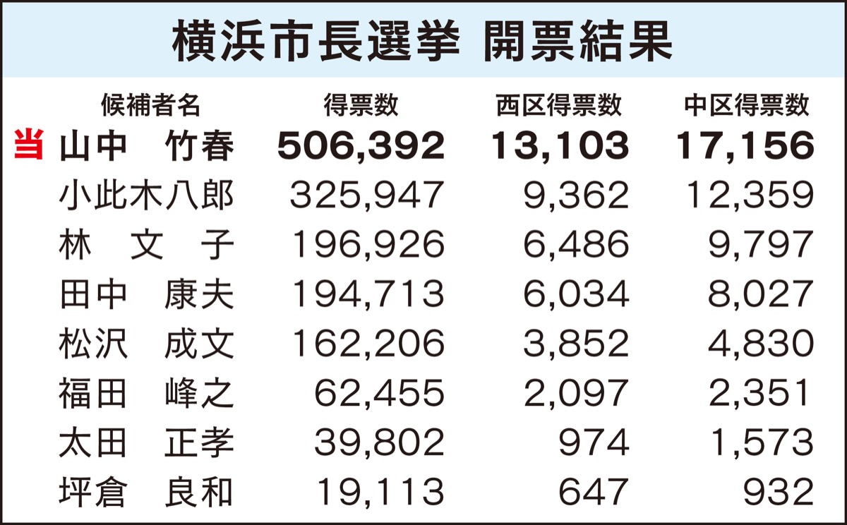 任期満了に伴う横浜市長選挙が8月22日に投開票され、無所属で新人の元横浜市大教授、山中竹春氏(48)=立憲民主党推薦=が約50万票を得て初当選した。過去最多の8人が立候補する中、自民党と公明党が中心に支援した小此木八郎氏(56)や4選を目指した現職の林文子氏(75)らを破り、12年ぶりの市長交代となった。山中氏は争点の一つだった統合型リゾート(IR)誘致に反対しており、市の方針が転換される。投票率は49・05%で前回を11・84ポイント上回った。