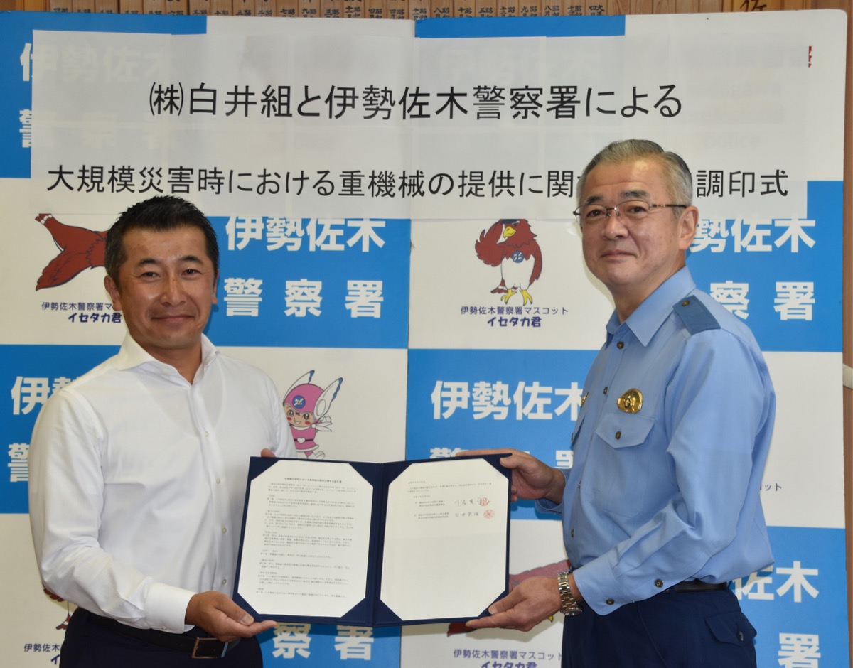 同署では、災害などの緊急時に警察車両への燃料提供や警察署の建物倒壊時に活用する施設の確保など、15団体・事業所と協定を締結しており、白井組で16団体目。災害時に重機械提供を定めた同様の協定は、県内54署のうち27署39件あるという。