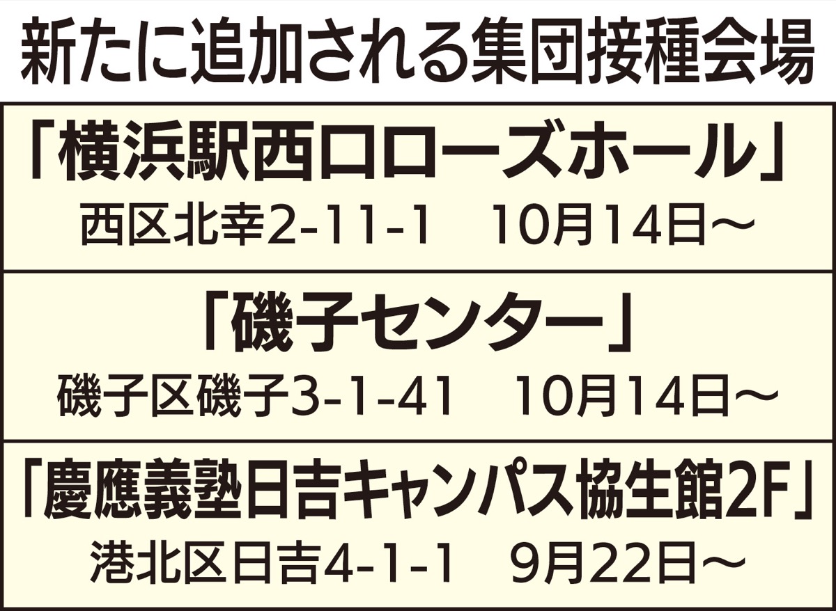 横浜市は9月6日、新たに新型コロナウイルスワクチンの集団接種会場を開設すると発表した。また、午後5時以降の夜間でも対応できる会場も増やした。