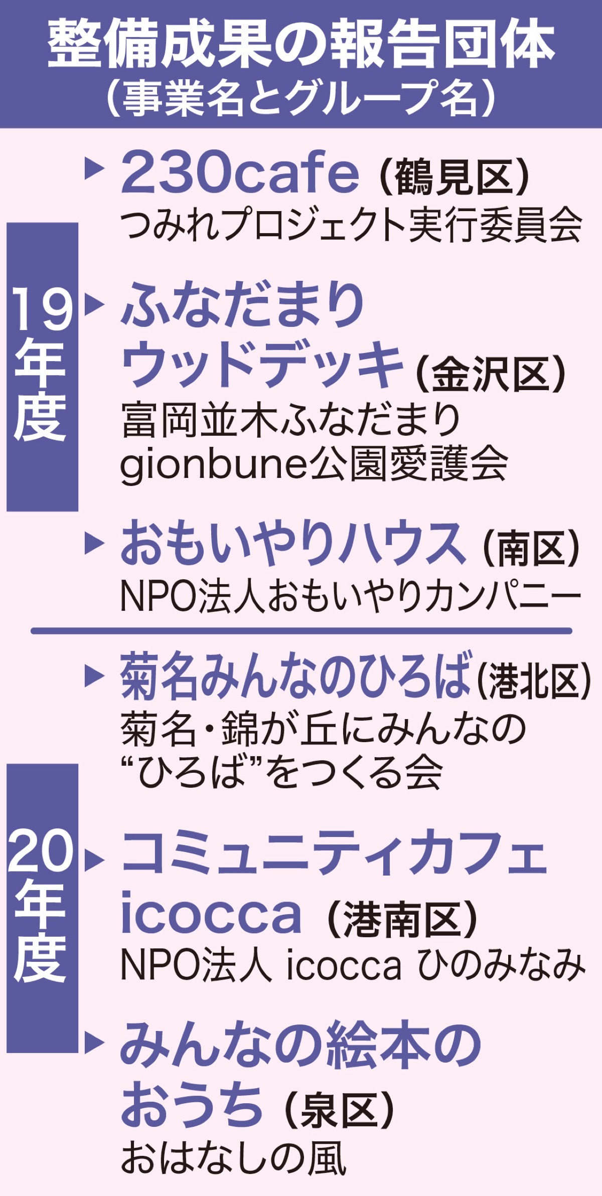 地域の課題解決や魅力向上を目的とした提案に横浜市が助成する「ヨコハマ市民まち普請事業」。過去2年に同事業の助成を受けて整備された施設および現在の活動状況の報告会が9月23日、ユーチューブでライブ配信される。時間は午前9時30分から午後0時45分まで。