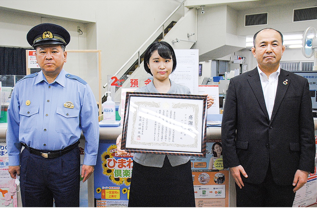 詐欺を未然に防いだとして9月14日に山手警察署は、かながわ信用金庫山元町支店、支店長の石川宗亨さんと職員の柴田真友子さんに感謝状を贈呈した。