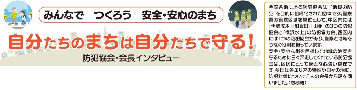 (天笠)横浜駅周辺からみなとみらい21地区、また住宅地と様々な顔を持つ西区全体が活動エリアです。近年、マンションなどが数多く建ち、新旧の住民の割合は同じくらいになっています。防犯意識を共有していくためにも、住民同士の横の連携がより一層重要です。協会としては小中学生対象の「防犯ポスターコンクール」を今年も実施して、子どもたちの防犯意識向上に取り組みます。コロナの影響は大きいですが、その中でもできる活動をしっかり継続させていきたいと思います。