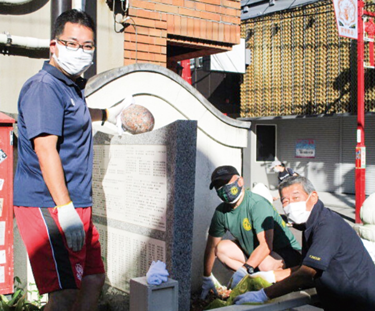 「日本のラグビー発祥の地記念碑」が設置されている横浜中華街内の山下町公園で9月20日、横浜市内にある3つのラグビースクール(横浜RS、グリーンクラブRS、田園RS)と山下町町内会の有志による合同清掃が行われた。