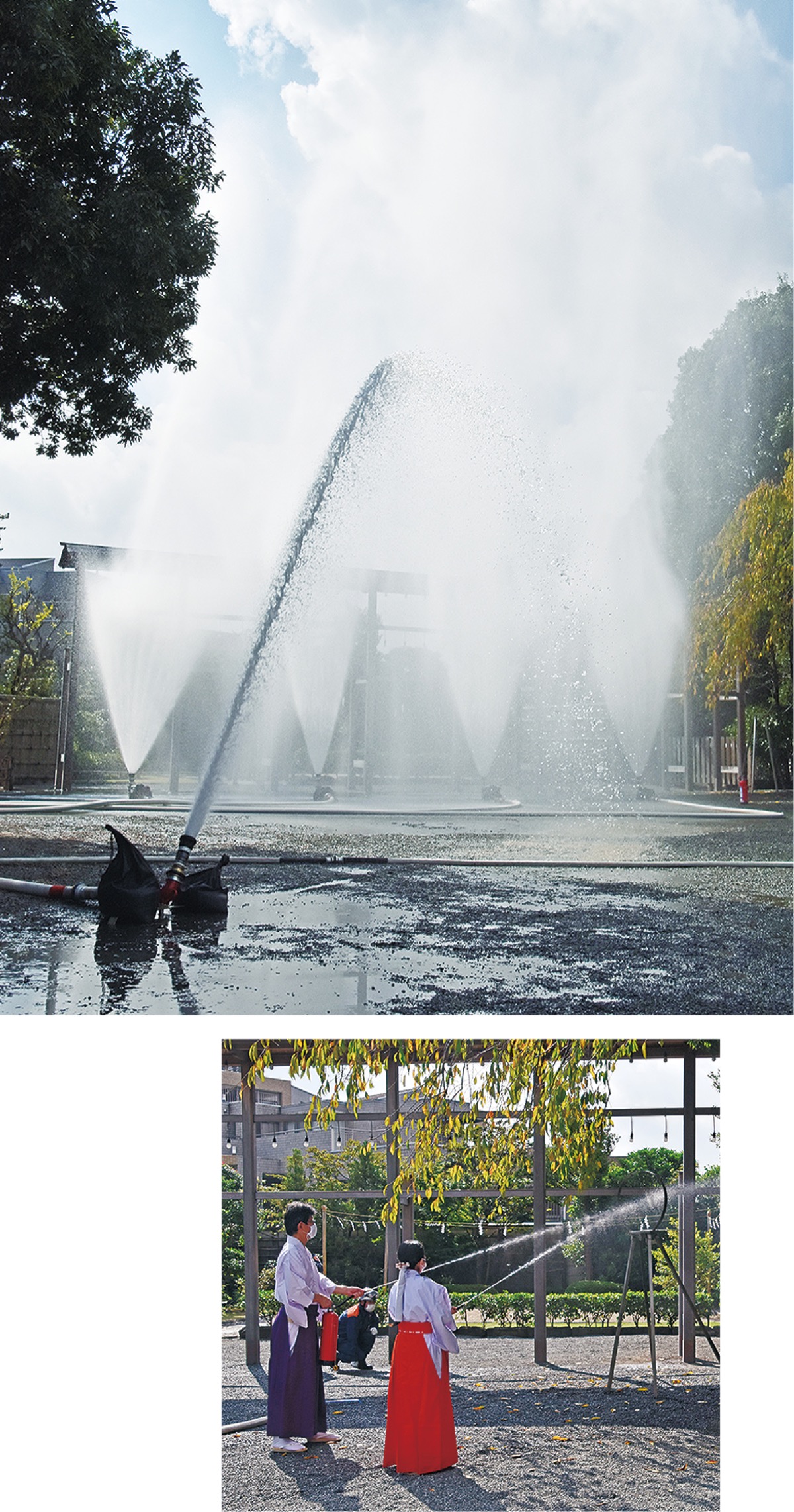 社務所から出火した想定で、神社の職員が初期消火。その後、上空に水を噴き上げ強力な水幕をつくる最新器具5器を使い、延焼を防ぐ訓練を行った。この器具は市消防局職員により考案されたもので特許取得済み。