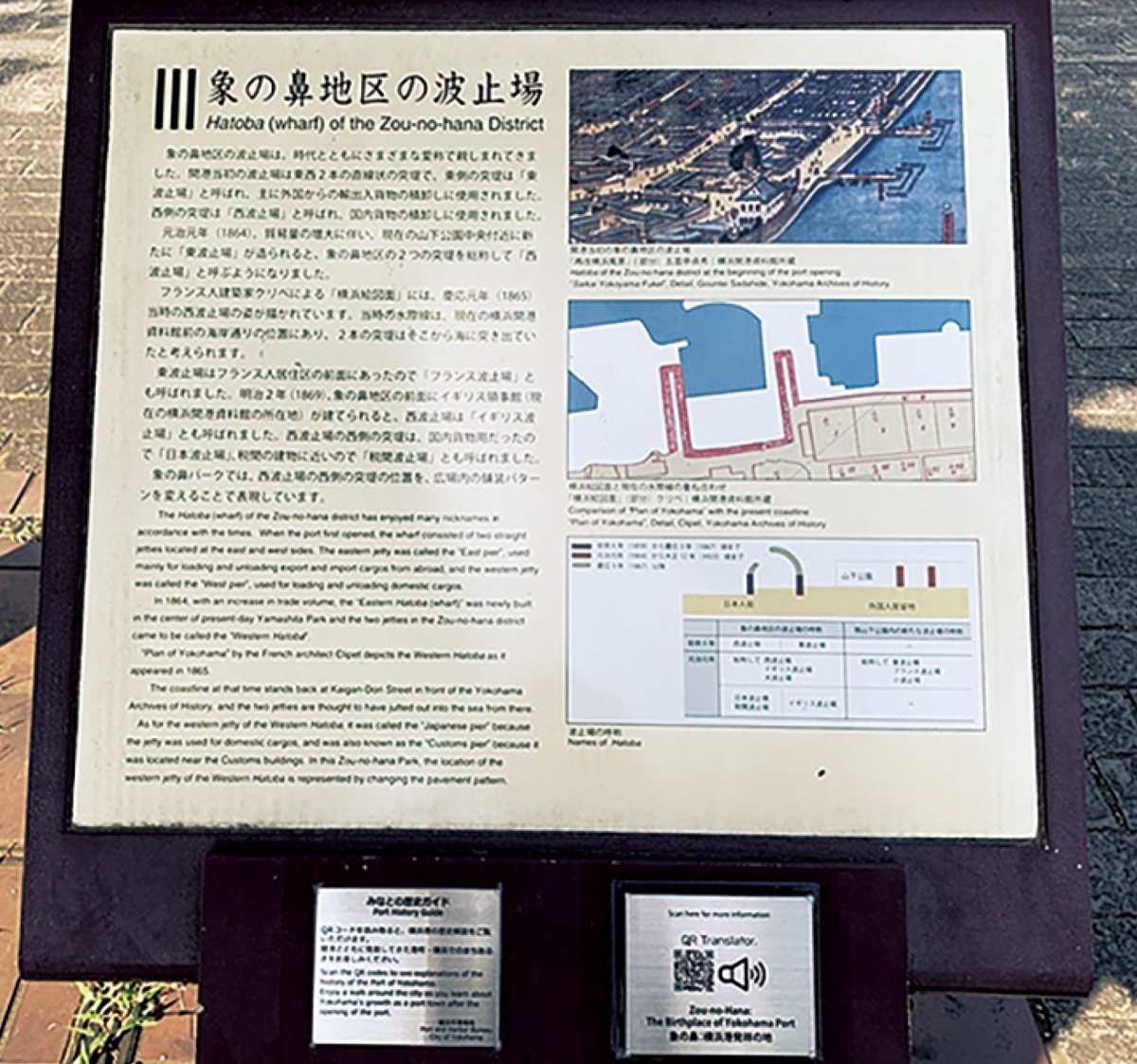 桜木町駅前や赤レンガパークなど、7カ所に設置された12種類の「みなとの歴史ガイド」の二次元コードをスマートフォンで読み取ると、横浜港周辺の歴史が音声と文章で解説される。