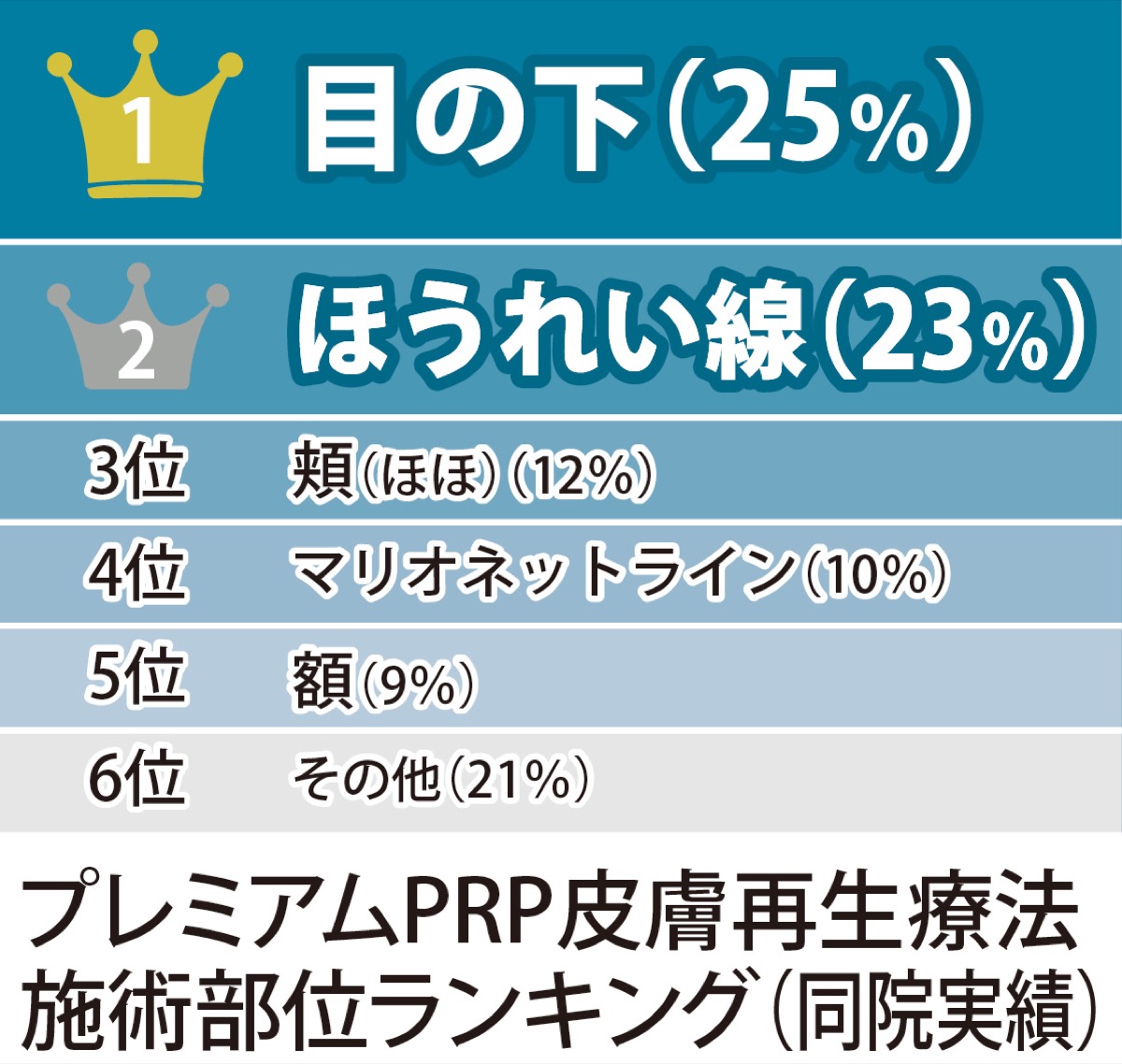 「PRP治療」は、血液から取り出した血小板成分(PRP)を皮膚組織内に注入することで組織の活性化をはかる若返り術です。当院で行っている「プレミアムPRP皮膚再生療法」は、PRPに適量の成長因子を加えることで、これまで効果が安定しにくかった目の下のクマ・たるみ、口のまわりのシワ(ほうれい線)・首のシワ・手の甲、また深いシワも改善可能な治療法となっています。従来施術では1回の注入で効果が約1年だったのに対し、同治療法では1回の注入で3年以上効果が持続し6年経過しても良い状態の方も(個人差あり)。20代から90代まで幅広い年齢層の人が受けています。来院時ご自分と似た症例写真などをお見せすることも可能です。当院ではのべ6万4211件と豊富な治療実績があります。
