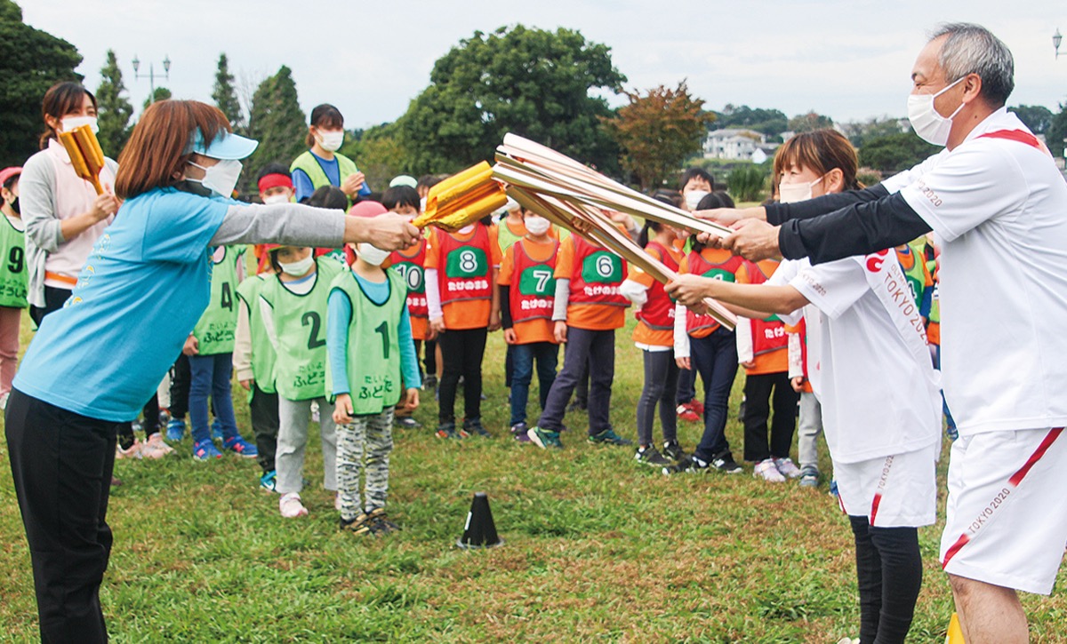 駅伝競走で園児たちは、バトンを握りしめ、ゴールまで懸命に駆け抜けた。トーチの貸し出しに協力した飯田さんは「コロナ禍で沿道を走る聖火リレーができなかったが、子どもたちに本物のトーチで実演ができよかったです」と話した。
