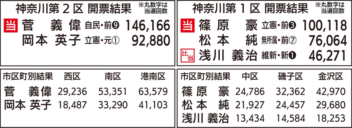 衆議院議員選挙の投開票が10月31日に行われた。神奈川1区(中区、磯子区、金沢区)では、立憲民主党の篠原豪氏(46)が選挙区で初当選した。前職で今回無所属での選挙となった松本純氏(71)は議席を失った。2区(西区、南区、港南区)では、前職・菅義偉氏(72)が次点候補に大差をつけて9選を決めた。