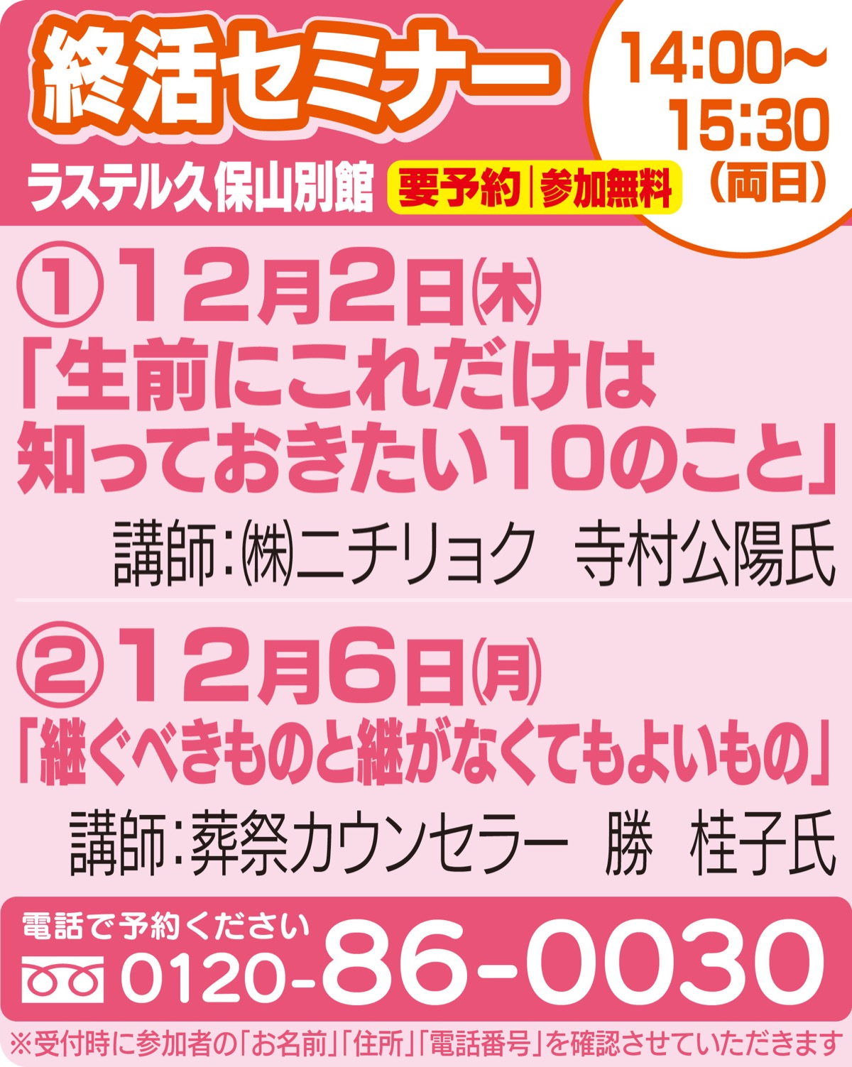 西区の家族葬専門ホール「ラステル久保山」で、「これだけは知っておきたい」重要点をまとめた内容と、葬祭カウンセラーによる「継ぐべきものと継がなくてもよいもの」の2つのセミナーが開催される。参加無料。開催日時は図参照。