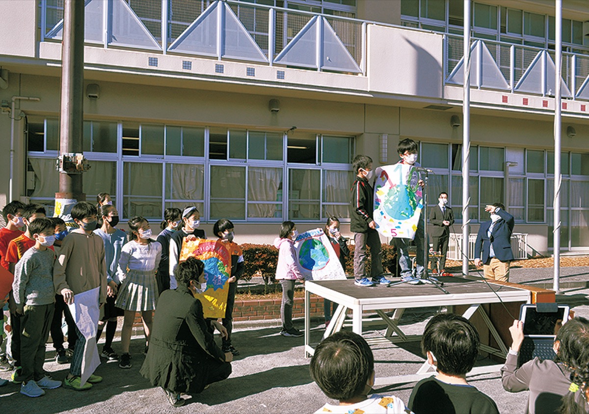 その後校庭に移動し、クラスごとにお祝いメッセージを書いたポスターを掲げながら、1年生から6年生までのクラス代表の2人が「クラスで頑張ること」を発表。「友達や先生の話を集中して聞けるように頑張ります」など、力強く宣言した。保護者を代表して伊藤武洋さんから、記念品のファイルと学年目標や活動写真が掲載されたリーフレットが児童に手渡され、最後は校歌と100周年の時に作られた「輝く歴史ありがとう」を全員で合唱した。