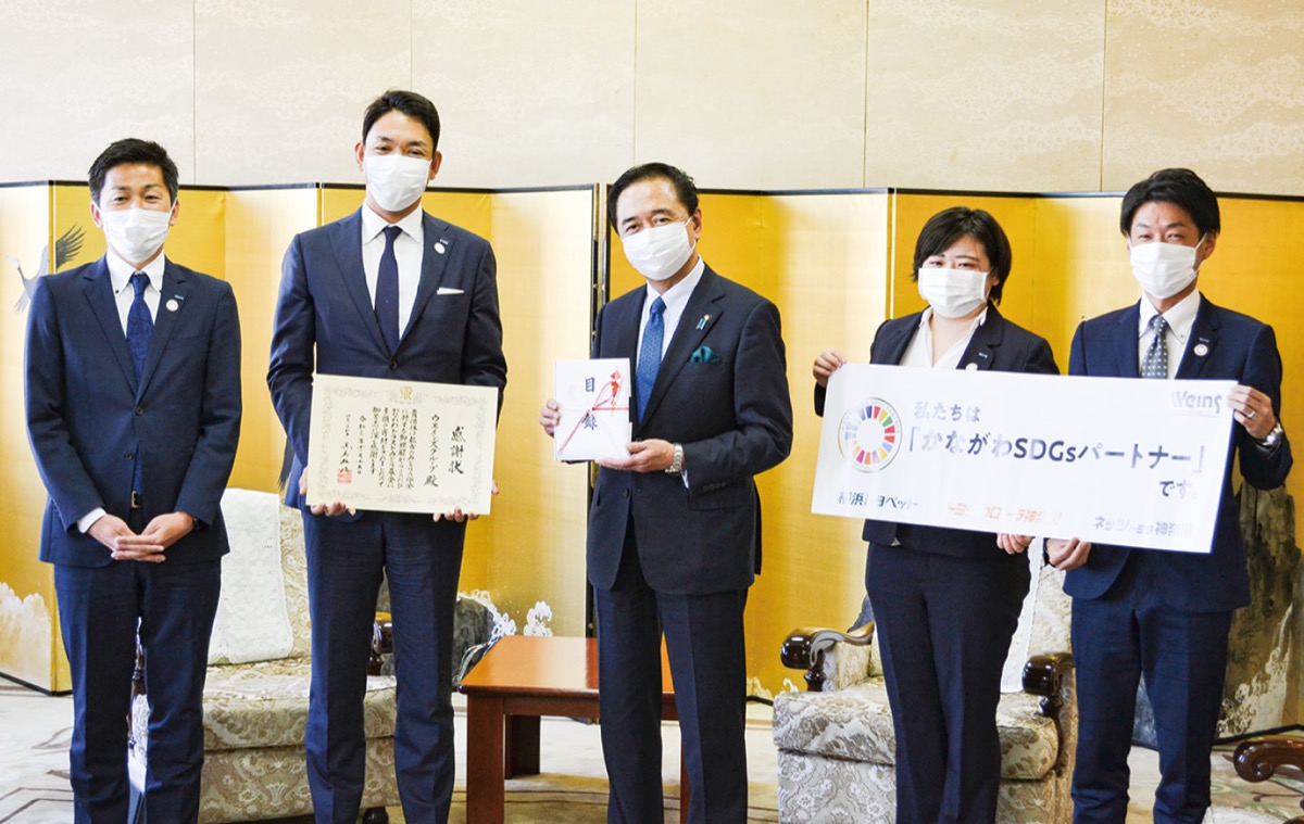 横浜トヨペット=中区山下町=など14社で構成されるウエインズグループが、県が緑化保全のため設置する「かながわトラストみどり基金」に180万円寄付したことを受け、11月15日に県庁で黒岩祐治県知事から感謝状が贈呈された。