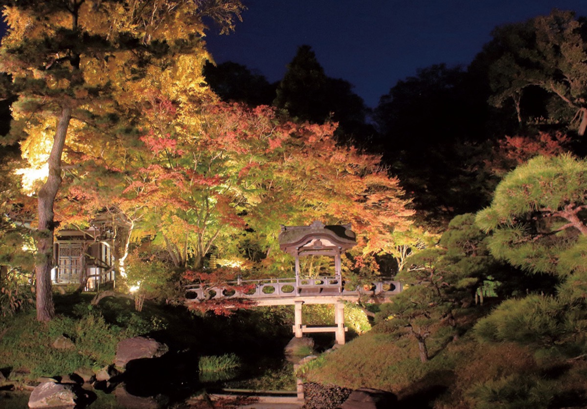 主なライトアップの対象▽外苑/旧燈明寺三重塔・旧燈明寺本堂・観心橋・涵花亭・鶴翔閣・横笛庵・海岸門・モミジ・滝▽内苑/御門・臨春閣・旧天瑞寺寿塔覆堂・聴秋閣・モミジ・イチョウ・蓮華院竹林