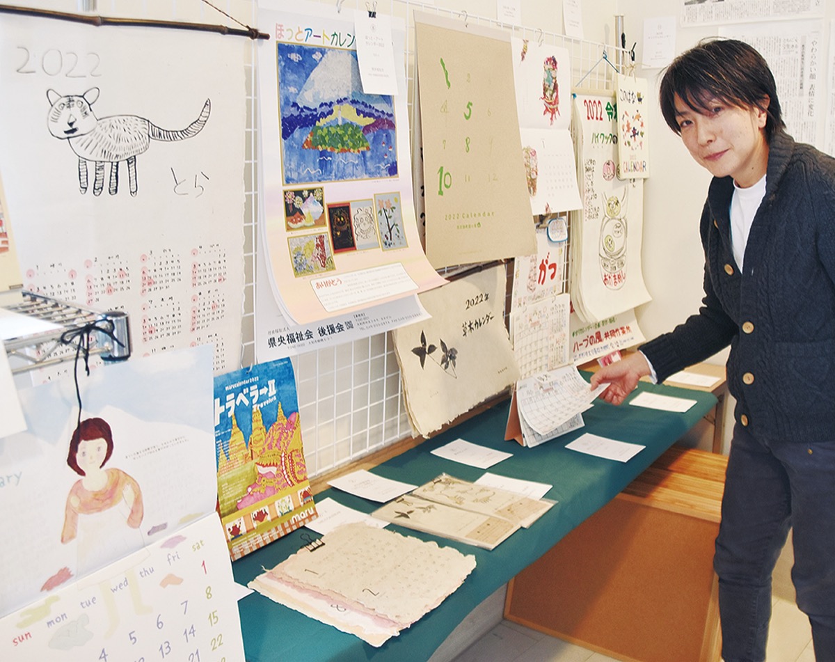 担当する同社の門松貴子さんは「ハンディがある人が作ったというだけでなく、こだわりがある作品を選んだ」と思いを語る。初開催の&COCOの小菅敏朗所長は「カレンダー販売の時期としては遅いですが、しっかり販売もします」と笑顔で話していた。