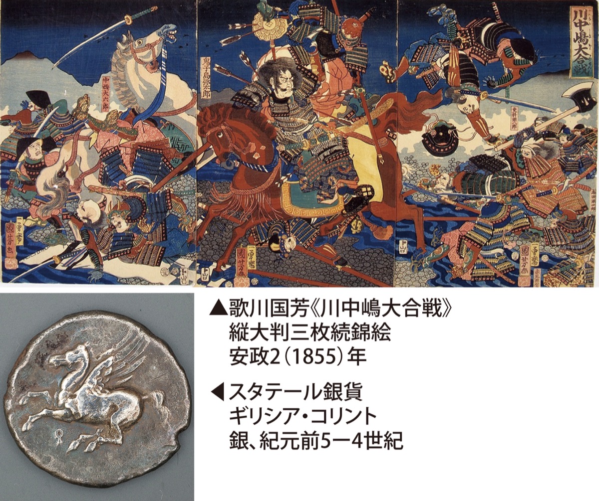 第2展示室で開催されている「武者絵の世界-人も馬も大あばれ-」では、源平合戦や戦国時代に活躍した武士や馬のエピソード、『三国志』に登場する豪傑らを描いた浮世絵版画を中心に展示し、画面を縦横無尽にあばれ回る人と馬の雄姿を紹介する。