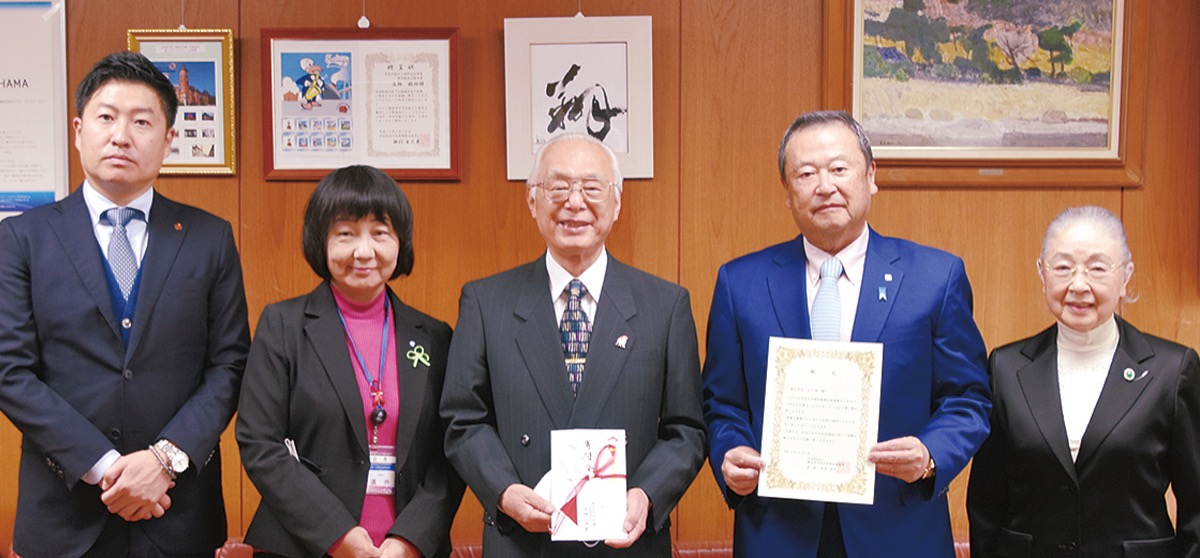 12月9日には、同社の高橋伸昌会長をはじめ山下裕大社長、会長の母で相談役の徳子さんらが中区役所を訪問、直井ユカリ区長と中区社会福祉協議会の松澤秀夫会長らが出迎えた。