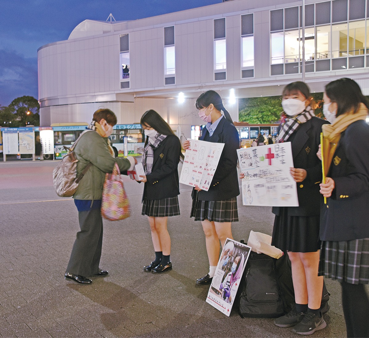 横浜女学院中学校高等学校の生徒8人が12月14日、桜木町駅前で「海外たすけあい」の街頭募金を行った。手づくりの募金箱と募金概要を解説したポスターを手に夕暮れ時の街頭で、行きかう人たちに声をかけていた。