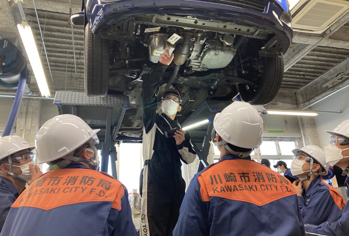 横浜トヨペット(株)(宮原漢二社長)=本社・中区=は、車両の基本構造や日常的な点検作業の大切さを学ぶ講習会「クルマの基本構造および車両火災」を12月13日、川崎市幸消防署の署員らを対象に藤沢技術教育センター=藤沢市=で開催した。