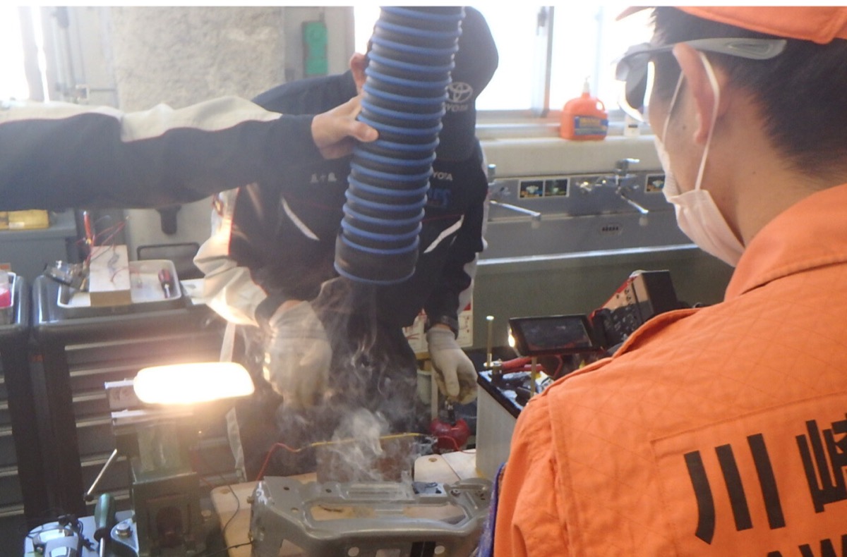 同講習会は川崎市幸消防署からの依頼で、車両火災における原因調査や実況見分のスキルアップを目的として実施されたもの。同社サービス部の技術研究室の職員が講師となり、幸署、川崎署、中原署などの川崎市火災調査所属職員14人が参加。事故発生時におけるハイブリット車の電源の遮断方法や、配線および燃料の経路など構造を確認したほか、目の前で実際に配線をショートさせ発火の仕組みを学んだ。