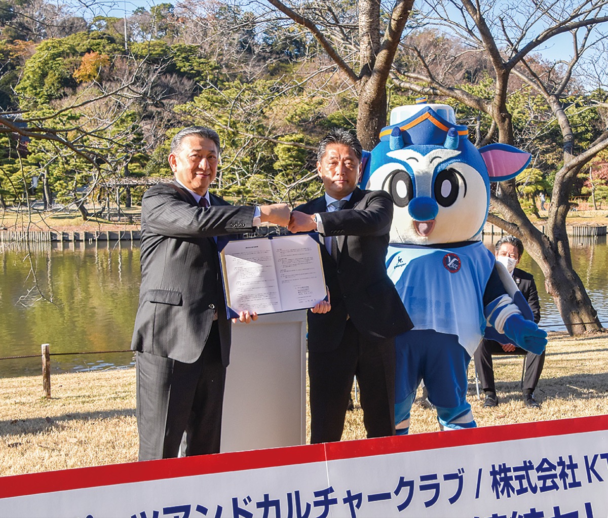 式典にはYSCCの吉野理事長とKTグループの上野会長兼社長をはじめ関係者が出席。青空の下、大池を背にした庭園で締結書を交わした。